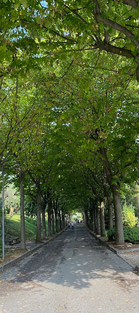 Het blijft maar druppelen, maar verder is het niet erg spannend allemaal, dus we gaan toch maar even de benen strekken. De camping af en door een mooie villa wijk richting de haven van Moniga del Garda.